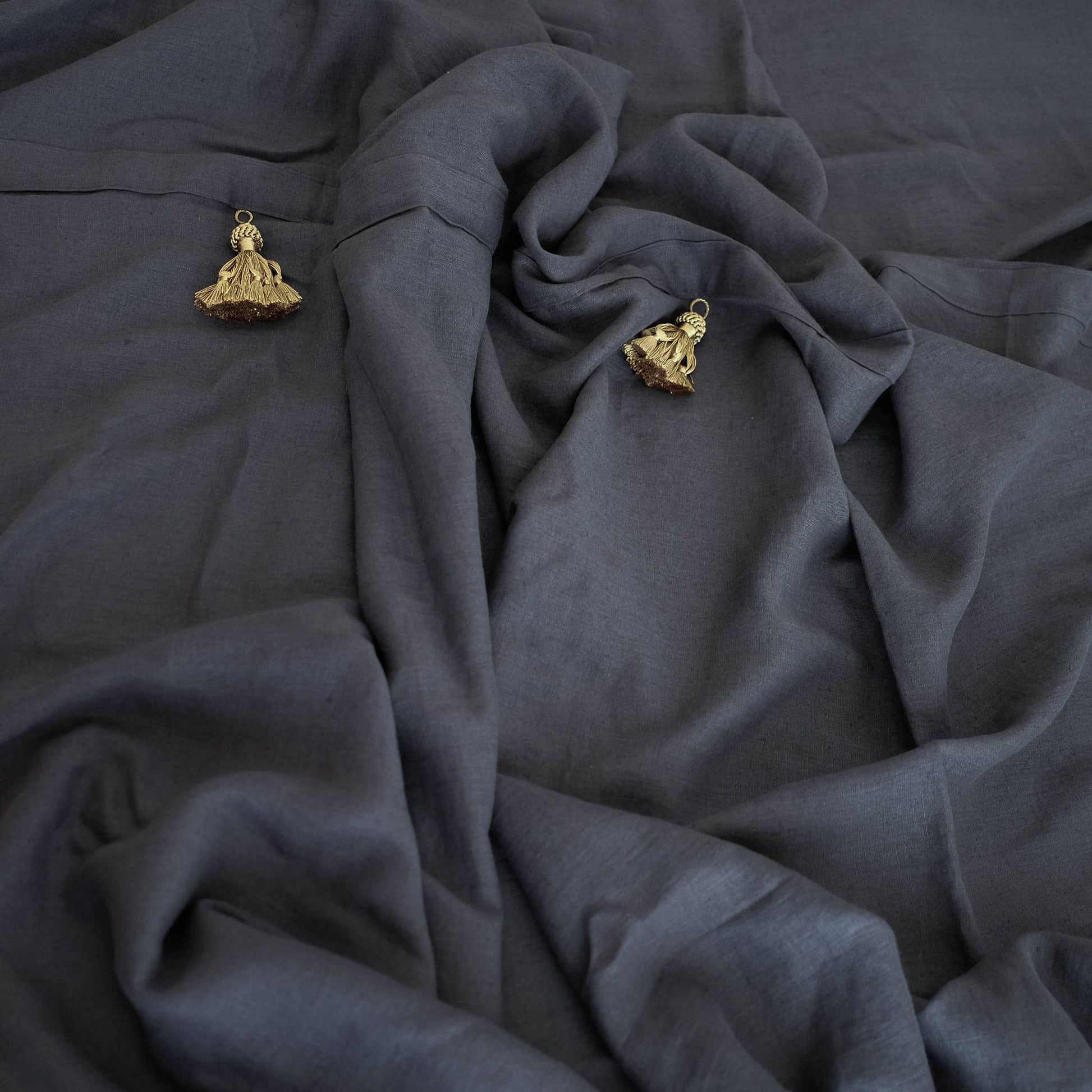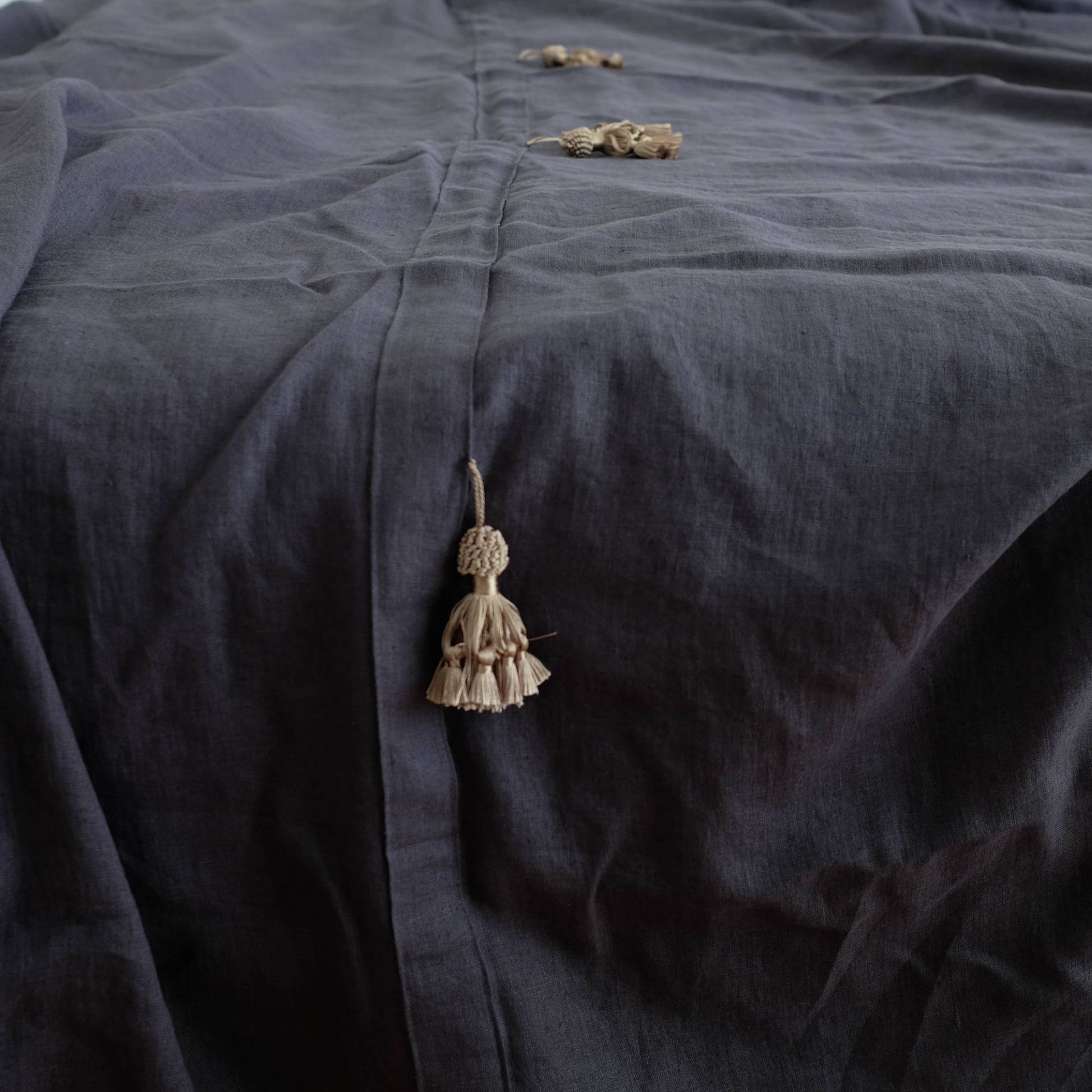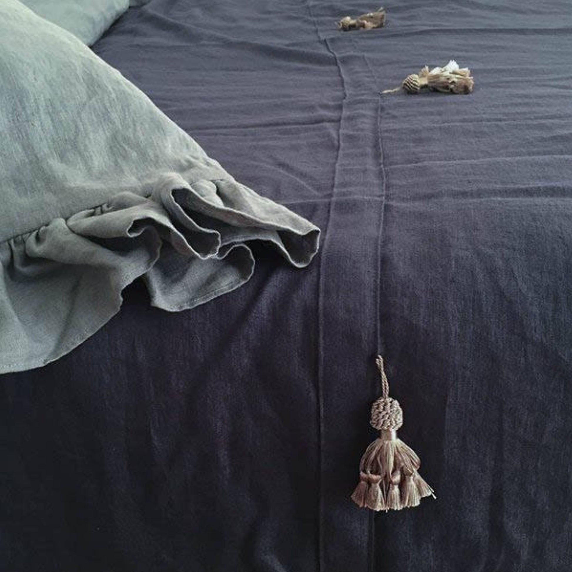 Bronze color satin tassels - 5 pieces attached to the linen bedspread.