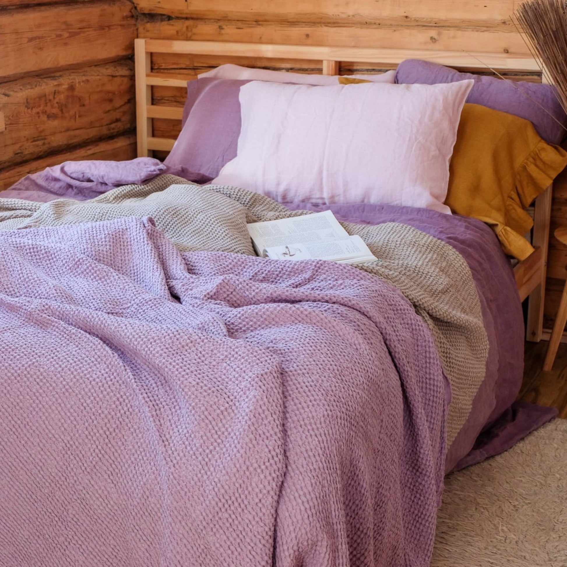 Beautiful light purple waffle textured linen bed cover, will create a bohemian, cozy atmosphere for your home. Made of soft linen this bed blanket has a texture, that is alike to a knitted one, thus creating a very unique look.