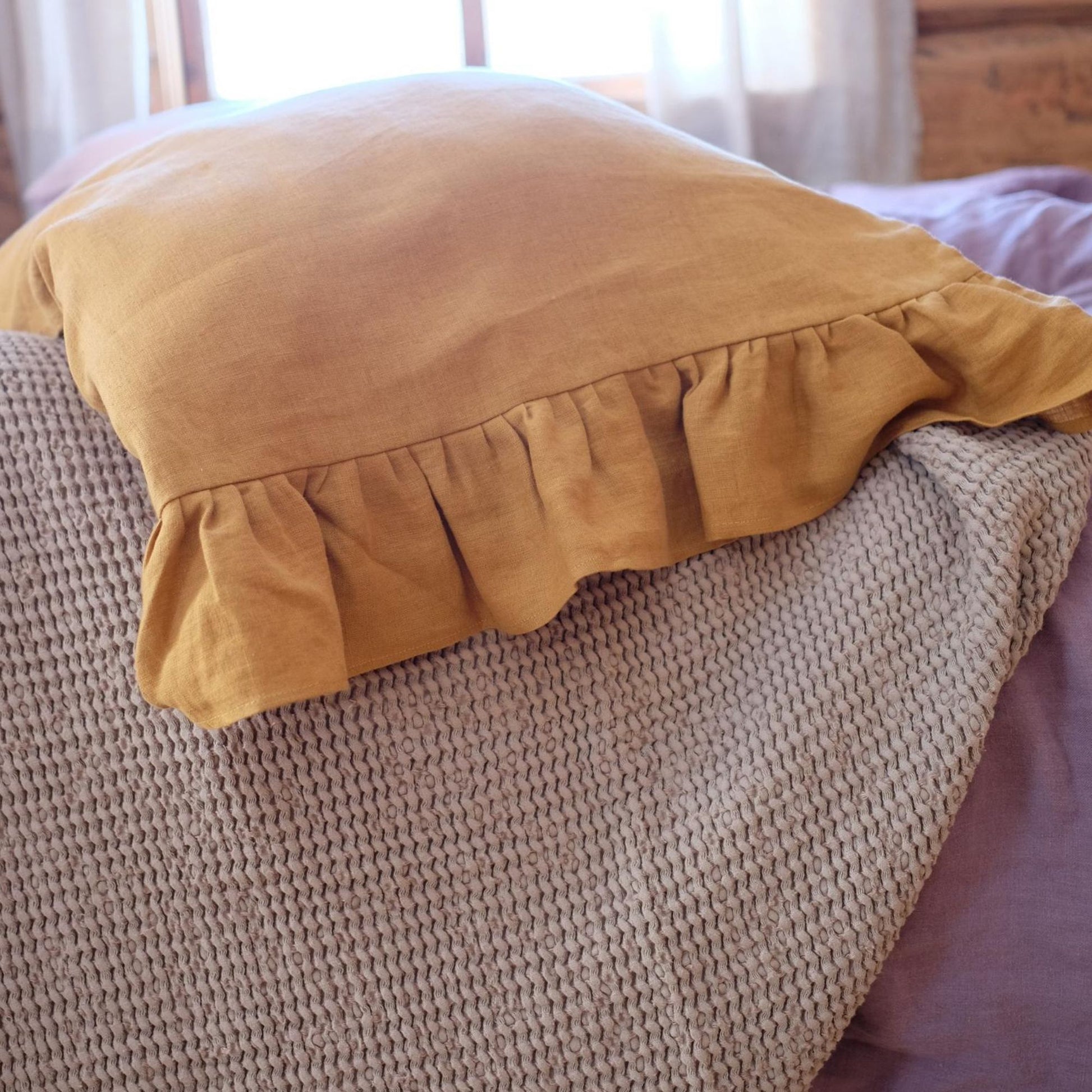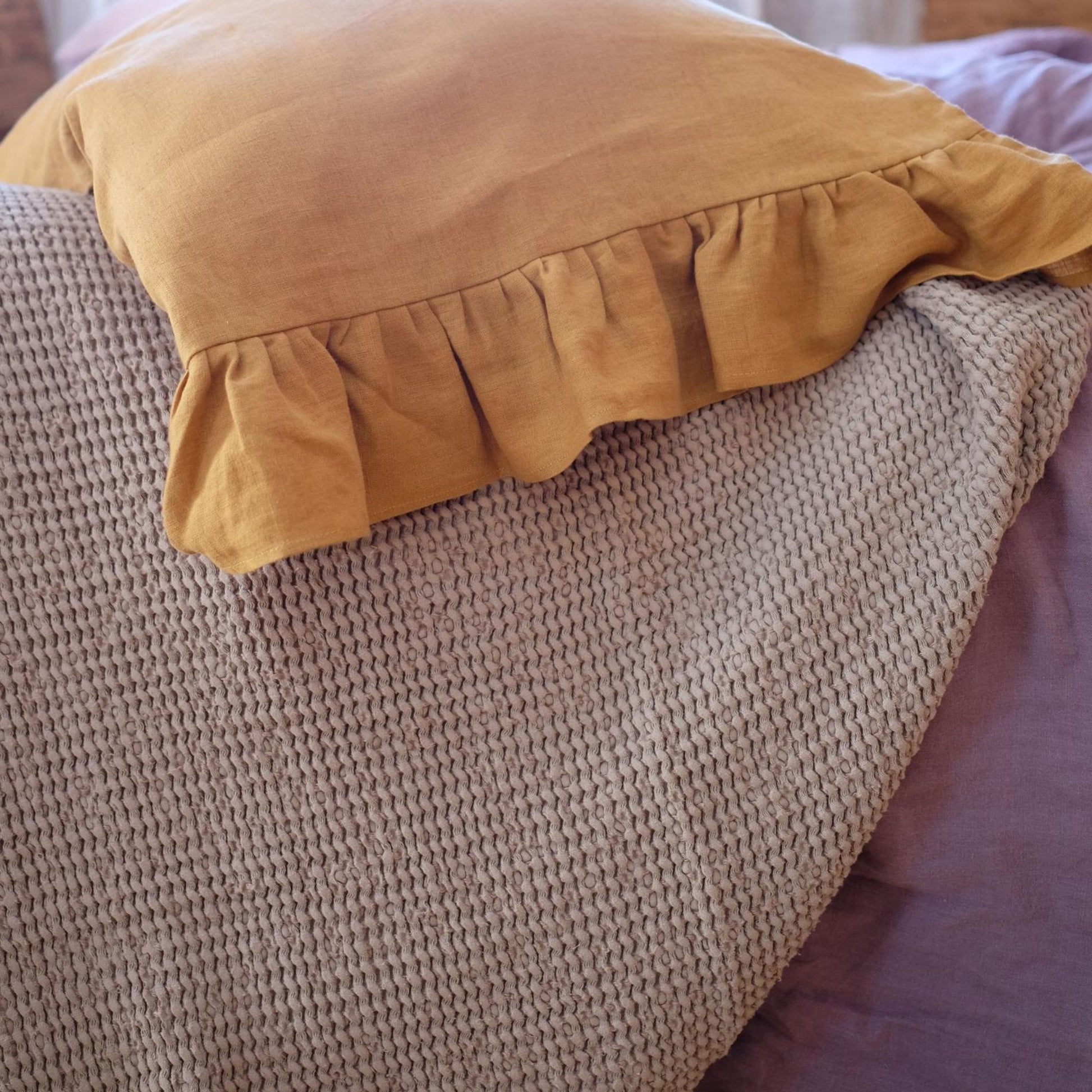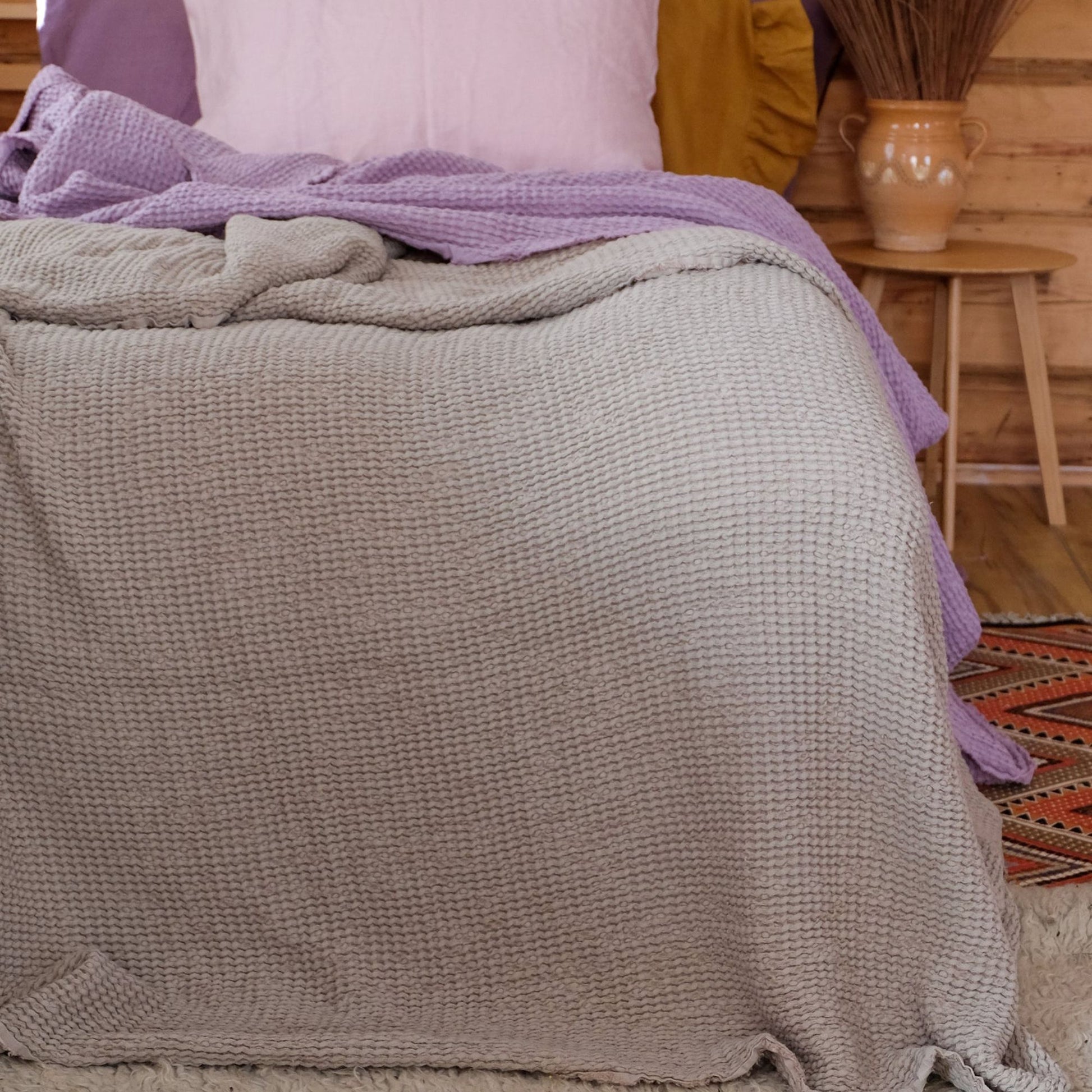 Beautiful light brown waffle textured linen bed cover, will create a bohemian, cozy atmosphere for your home. Made of soft linen this bed blanket has a texture, that is alike to a knitted one, thus creating a very unique look.