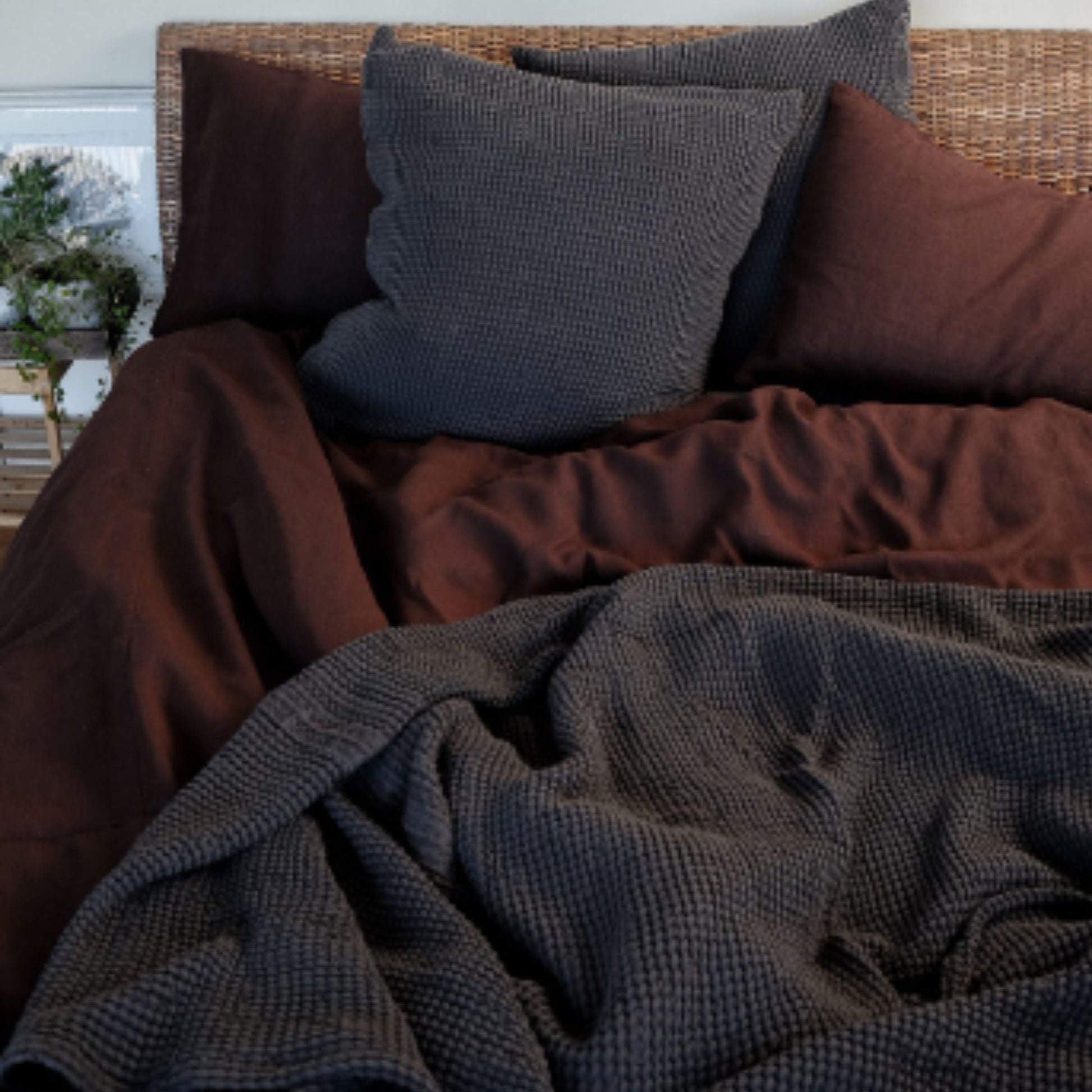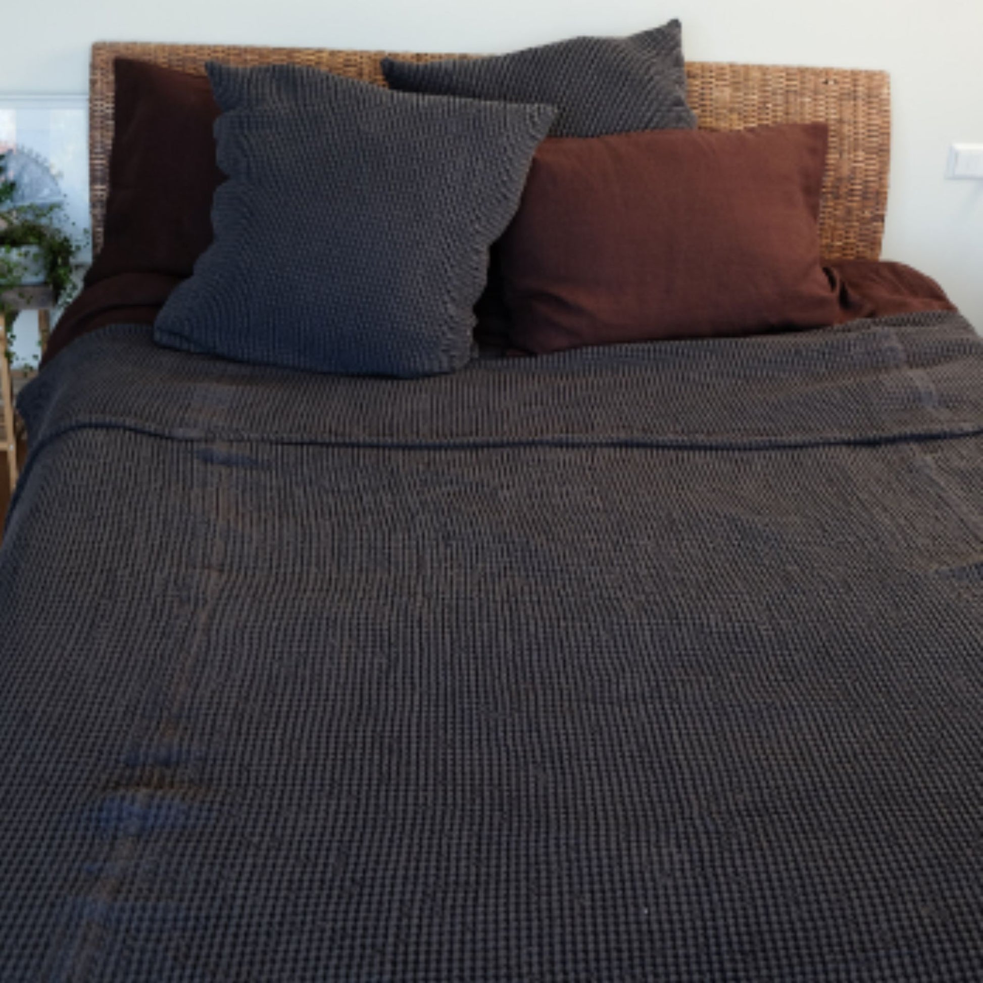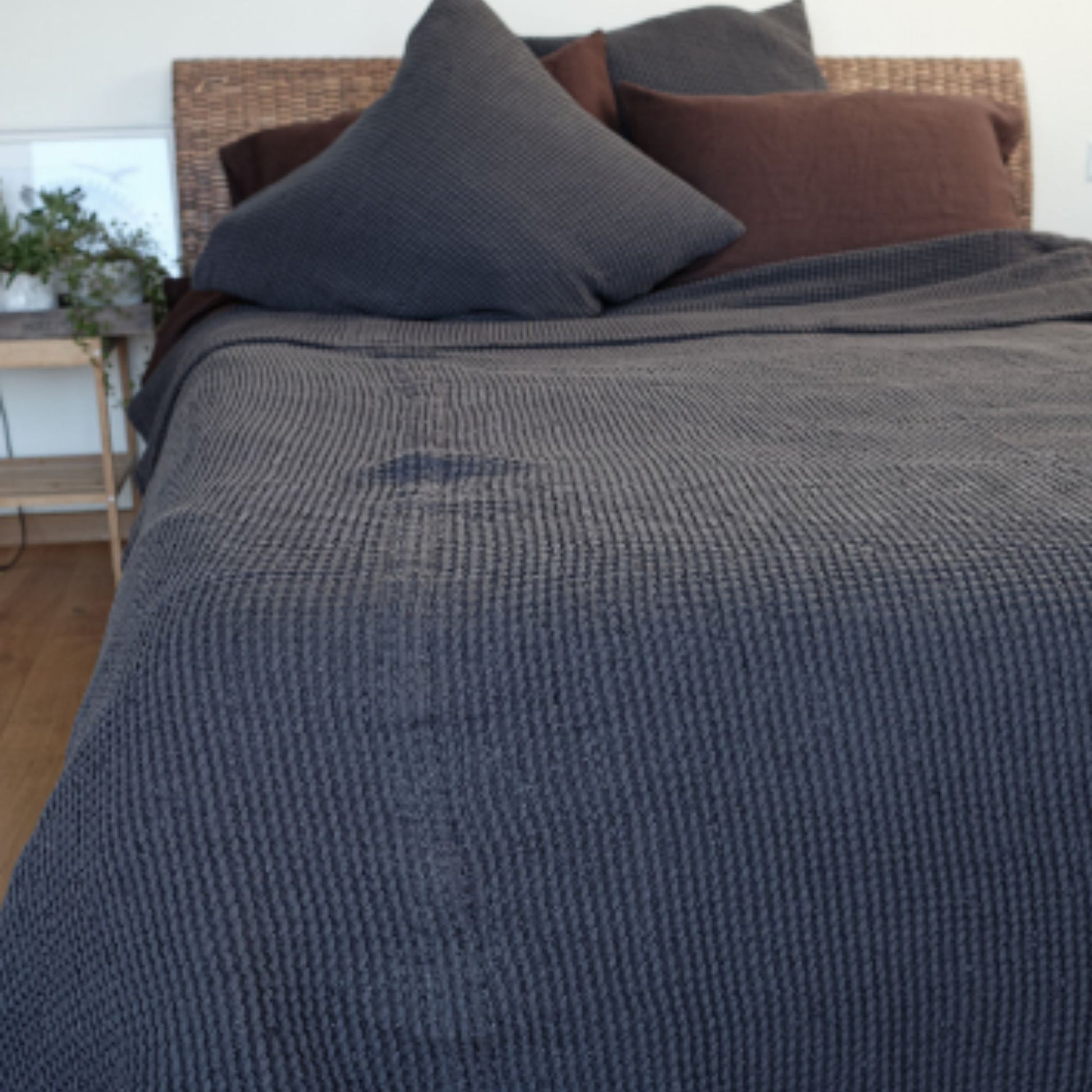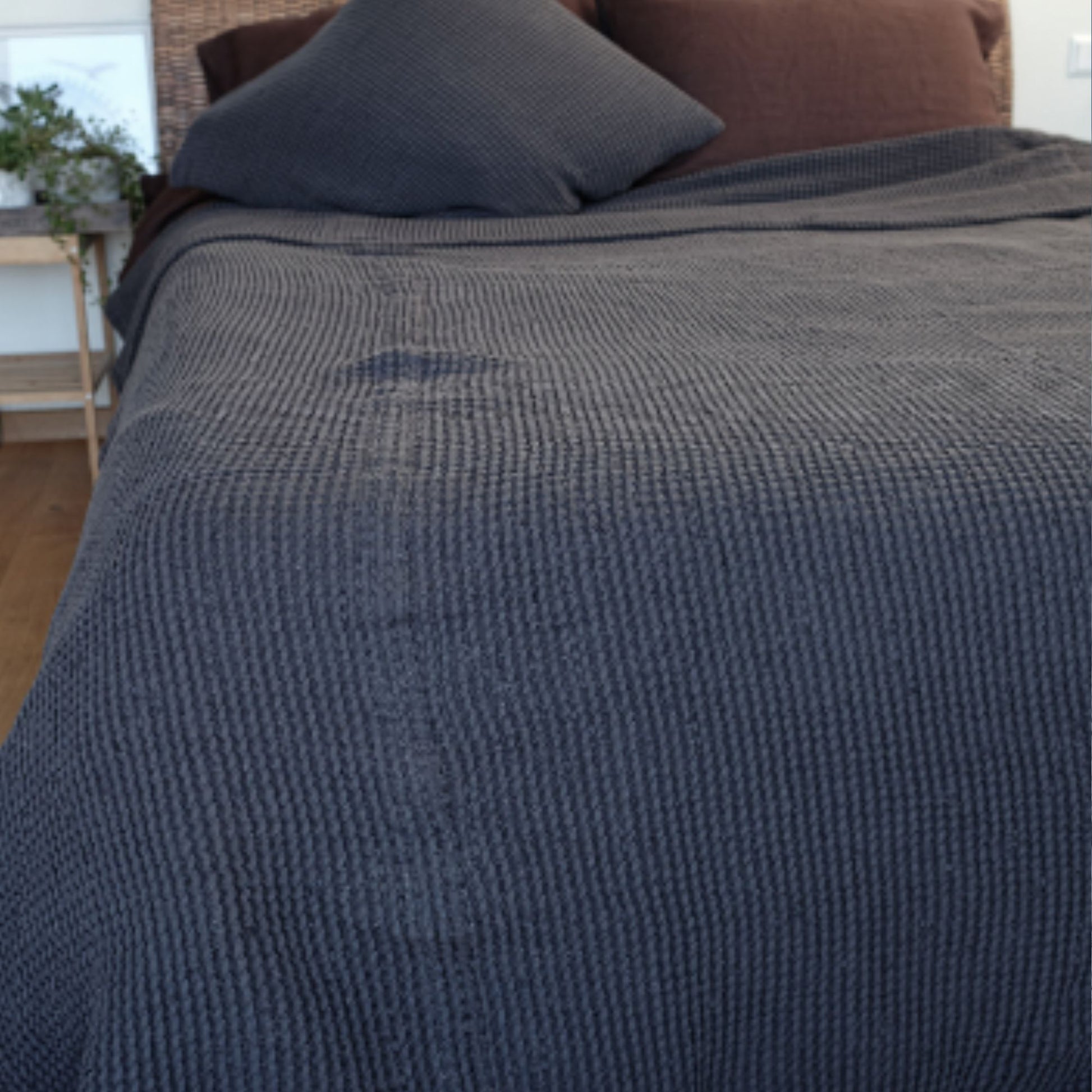 Beautiful gray waffle textured linen bed cover, will create a bohemian, cozy atmosphere for your home. Made of soft linen this bed blanket has a texture, that is alike to a knitted one, thus creating a very unique look.